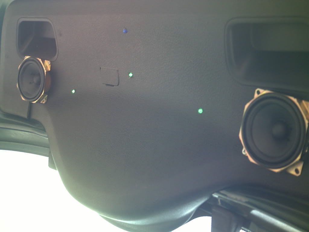 should take that rear boot pannel off, cut a hole for each speaker, and feed it in from behind so you dont have to look at all the uggly bits.